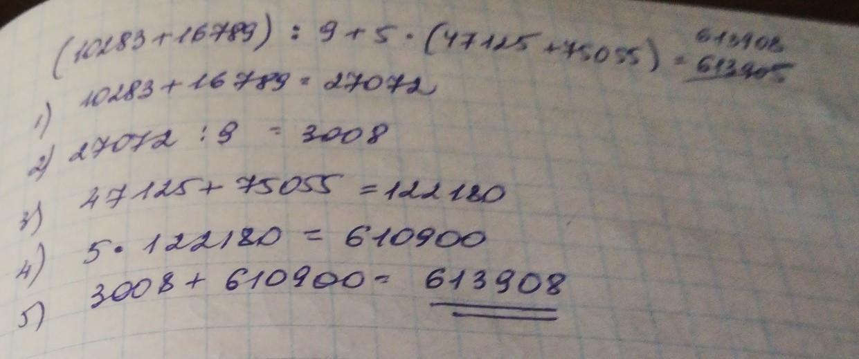 5 Я могу проверить правильность вычислений с многозначными числами. Проверь вычисления. 31 (10 283 + 16 789): 9+5 · (47 125 + 75 055) = 613 905