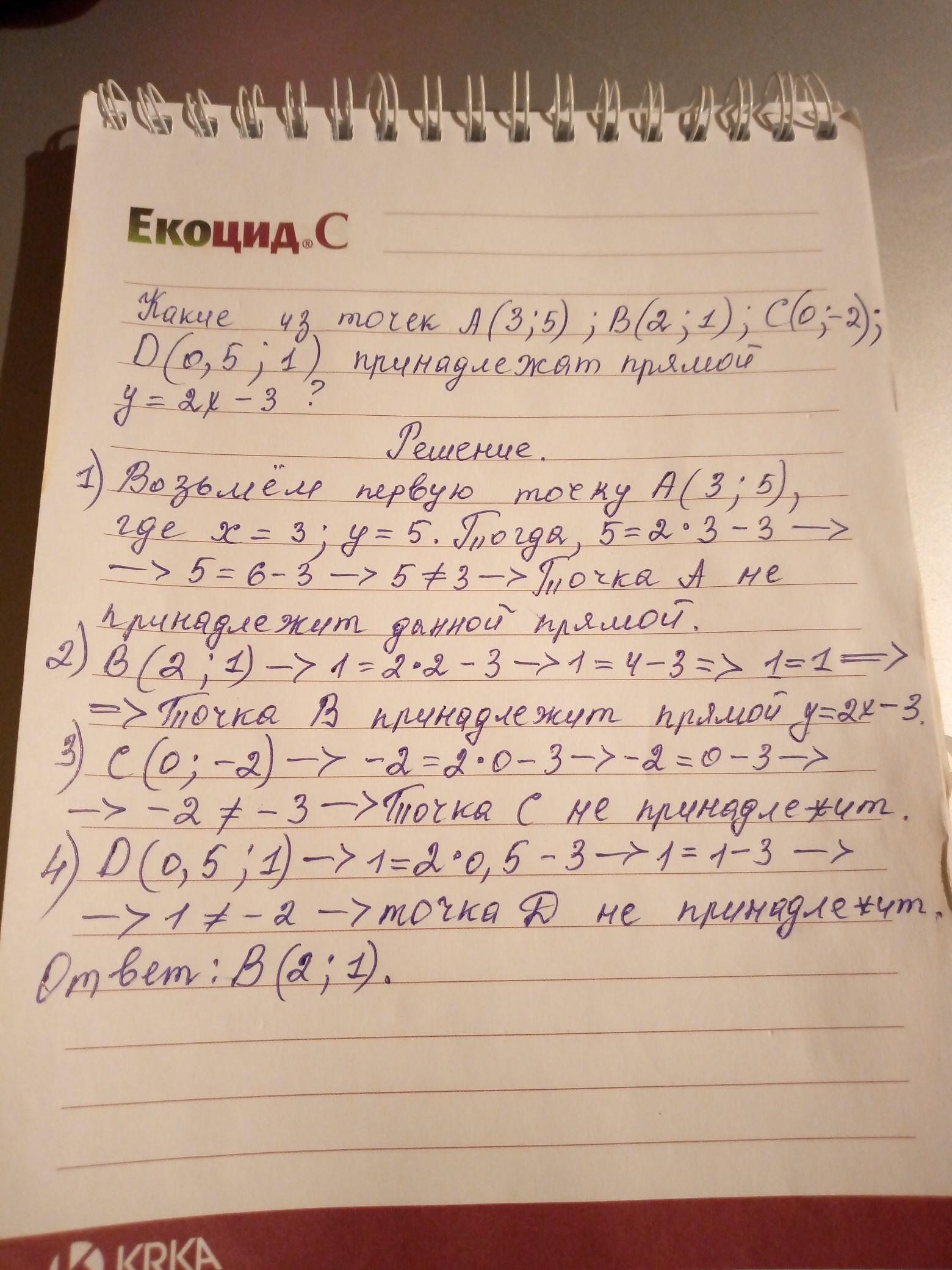 Какие из точек A (3; 5), B (2; 1), C (0; -2), D (0,5; 1) принадлежат прямой y = 2x − 3?