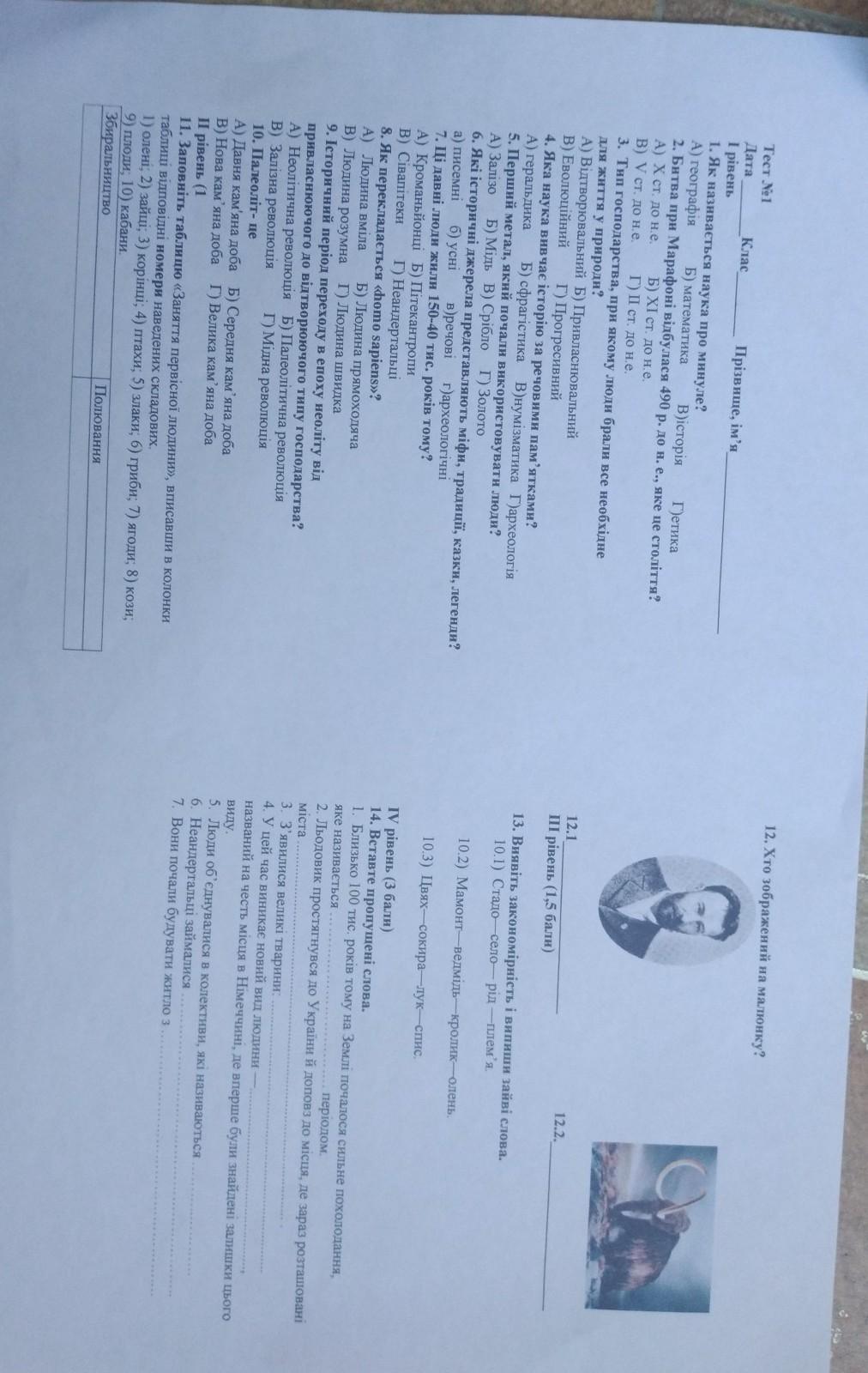 Тест No 1 1 Дата Клас Прізвище, ім'я І рівень 1. Як називається наука про минуле? A) географія Б) математика B) історія Гетика 2. Битва при Марафоні відбулася 490 р. до н. е., яке це століття? A) X ст. до н.е. Б) XI ст. до н. е. B) V ст. до н.е. Г) І ст. до н.е. 3. Тип господарства, при якому люди брали все необхідне для життя у природи? А) Відтворювальний Б) Привласнювальний В) Еволюційний Г) Прогресивний 4. Яка наука вивчає історію за речовими пам'ятками? A) геральдика Б) сфрагістика В)нумізматика Г) археологія 5. Перший метал, який почали використовувати люди? А) Залізо Б) Мідь В) Срібло Г) Золото 6. Які історичні джерела представляють міфи, традиції, казки, легенди? а) писемні б) усні в)речові г)археологічні 7. Ці давні люди жили 150-40 тис. років тому? А) Кроманьйонці Б) Пітекантропи В) Сівапiтеки Г) Неандертальці 8. Як перекладається homo sapiens»? А) Людина вміла Б) Людина прямоходяча В) Людина розумна Г) Людина швидка 9. Історичний період переходу в епоху неоліту від привласнюючого до відтворюючого типу господарства? A) Неолітична революція Б) Палеолітична революція В) Залізна революція г) Мідна революція 10. Палеоліт- це A) Давня кам'яна доба Б) Середня кам'яна доба В) Нова кам'яна доба Г) Велика кам'яна доба ІІ рівень (1 11. Заповніть таблицю «Заняття первісної людини», вписавши в колонки таблиці відповідні номери наведених складових, 1) олені; 2) зайці; 3) корінці; 4) птахи; 5) злаки; 6) гриби; 7) ягоди; 8) кон, Полювання Збиральництво 9) плоди; 10) кабани,