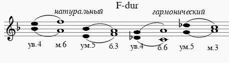 К тритонам относятся увеличенная кварта ув.4 и уменьшённая квинта ум.5. В тритоне три целых тона. В каждой тональности есть две пары тритонов: два в натуральном и два в гармоническом виде. В мажоре гармонического вида понижается VI ступень (в F-dur это ре♭)