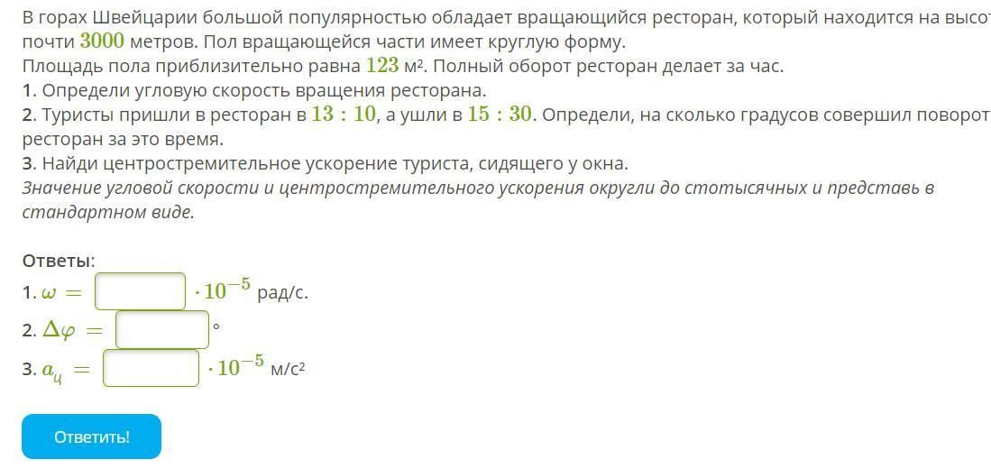 Значение угловой скорости и центростремительного ускорения округли до стотысячных и представь в стандартном виде.