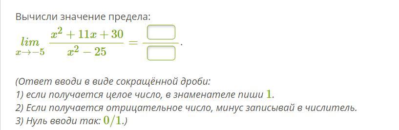 lim(x->-5) (x² + 11x + 30)/(x² - 25) = lim(x->-5) (x + 5)(x + 6)/(x - 5)(x + 5) = lim(x->-5) (x + 6)/(x - 5) = (-5 + 6)/(-5 - 5) = - 1/10 = 1/(-10)