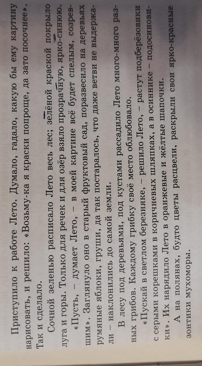 Лето думало и решило, гадало, расписало, покрыло, думает, заглянуло, поразвесило, постаралось, ветви не выдержали, лето Рассадило, облюбовало, нарядило. Сравнение будто цветы расцвели. Слово будто и есть доказательство.