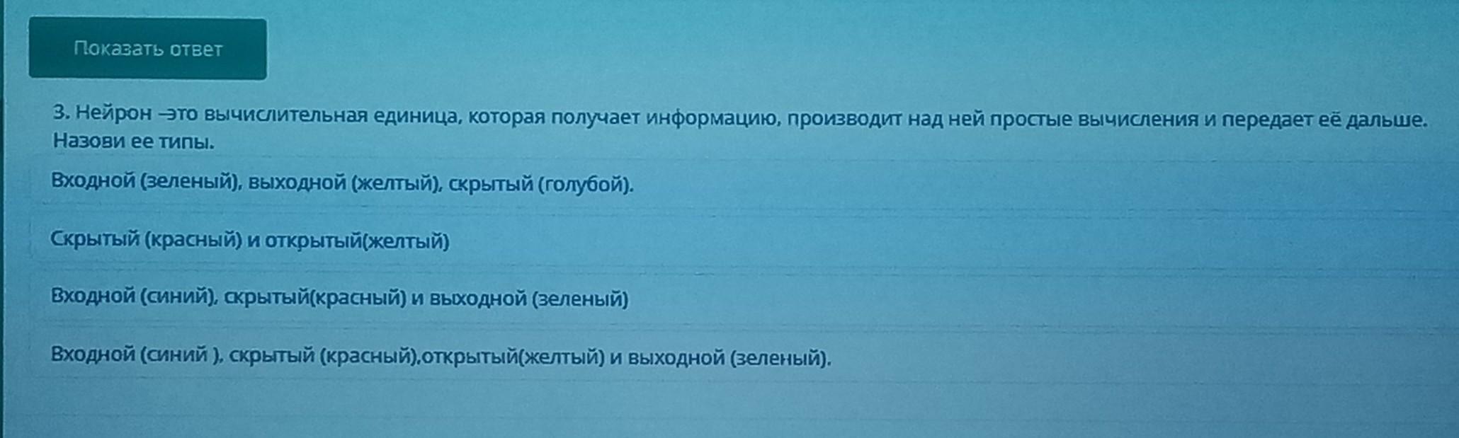 Входной (зелёный), выходной (жёлтый), скрытый (голубой).
