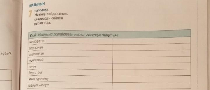 1)Мен мойныма желбіреген галстук киіп тұрмын.2)Менің достарым бауырмал.3)Класта жаңадан сырланған қабырғалар.4)Жаңа мұнтаздай еден.5) Мен өзіме сенемін.6)Мен мұғаліммен бірінші партада бетпе-бет отырамын.5) Таңертең төсектен атып түрегелдім.7)Ауызды шайып жіберу