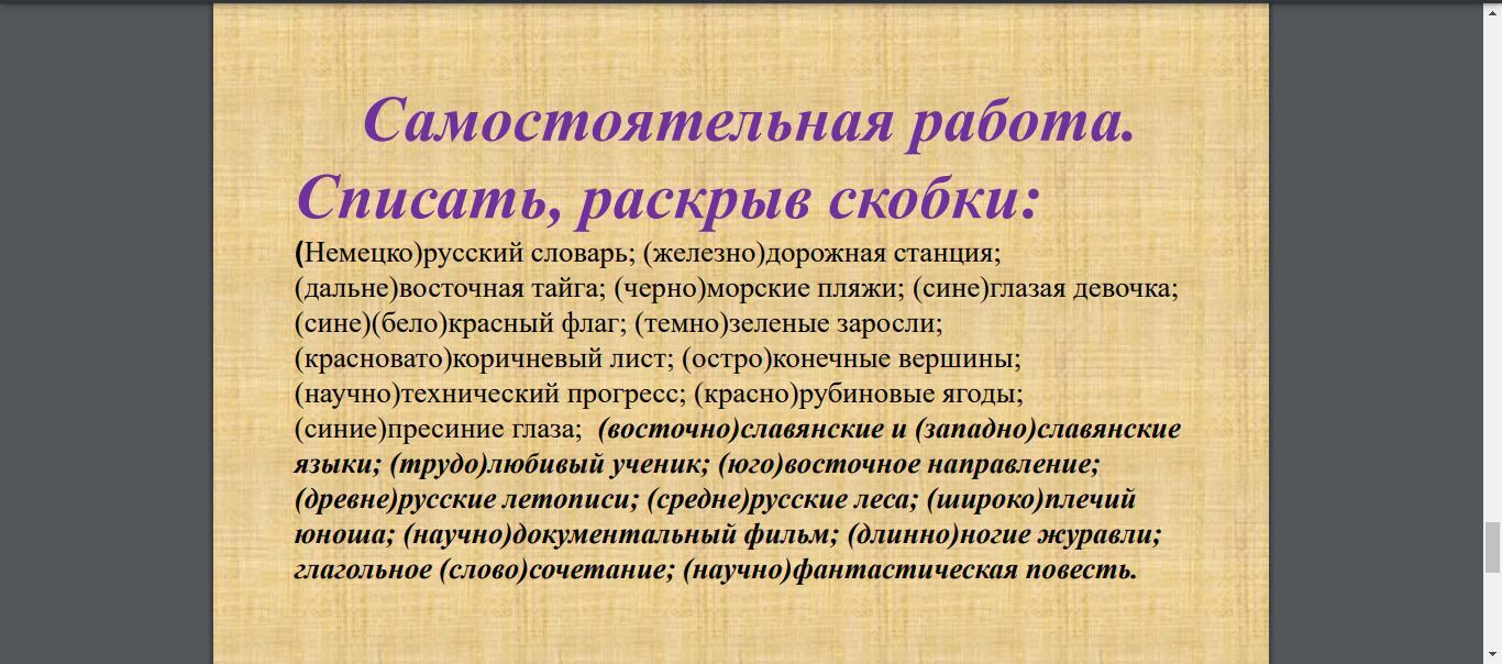 Немецко-русский словарь (написание двух прилагательных); железнодорожная станция (сложное прилагательное); дальневосточная тайга (прилагательное образованное от словосочетания); черноморские пляжи; синеглазая девочка; сине-бело красный флаг; темно-зеленые заросли ( два прилагательных); красновато-коричневый лист ( два прилагательных); остроконечные вершины; научно-технический прогресс; красно-рубиновые ягоды (два прилагательных); синие-пресиние глаза ( повторение); восточнославянские и западнославянские языки; трудолюбивый ученик; юго-восточное направление; древнерусские летописи; среднерусские леса; широкоплечий юноша; научно-документальный фильм; длинноногие журавли; глагольное словосочетание; научно-фантастическая повесть.