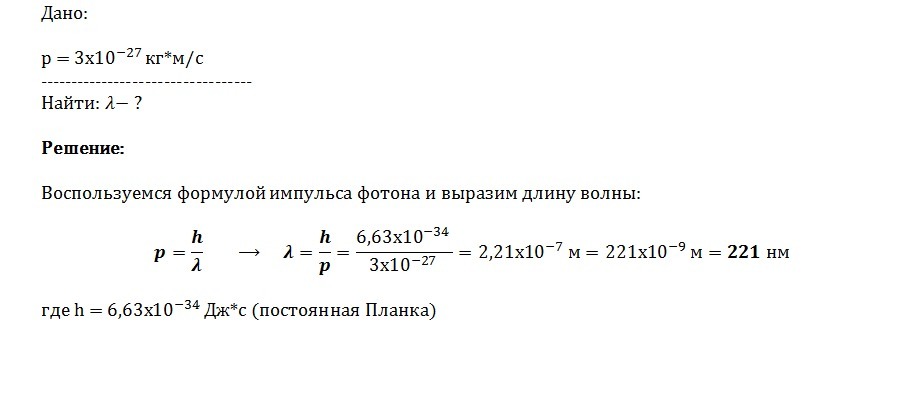 Определите длину волны ультрафиолетового излучения, импульс кванта которого при полном поглощении равен 3*10^-27 кг*м/с.