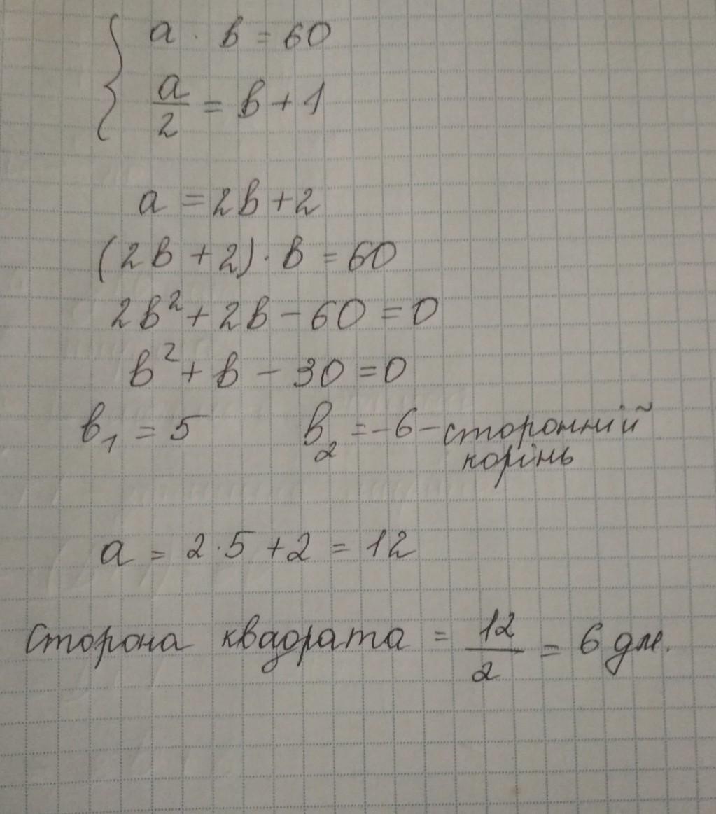 1) Довжина прямокутника на 5 м більша за ширину, а площа становить 24 м². Знайти сторони цього прямокутника. 2) Довжину прямокутника зменшили у 2 рази, а ширину збільшили на 1 дм і одержали квадрат. Знайти сторону квадрата, якщо площа прямокутника 60 дм².
