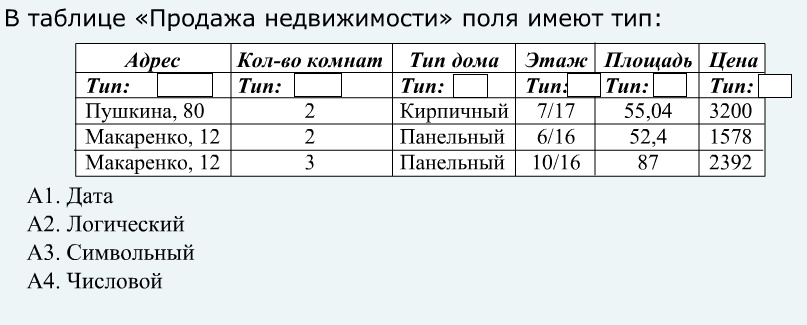Тип дома - тип А3 (символьный) хотя можно и логический при условии что существуют только 2 типа домов (кирпичный и панельный)