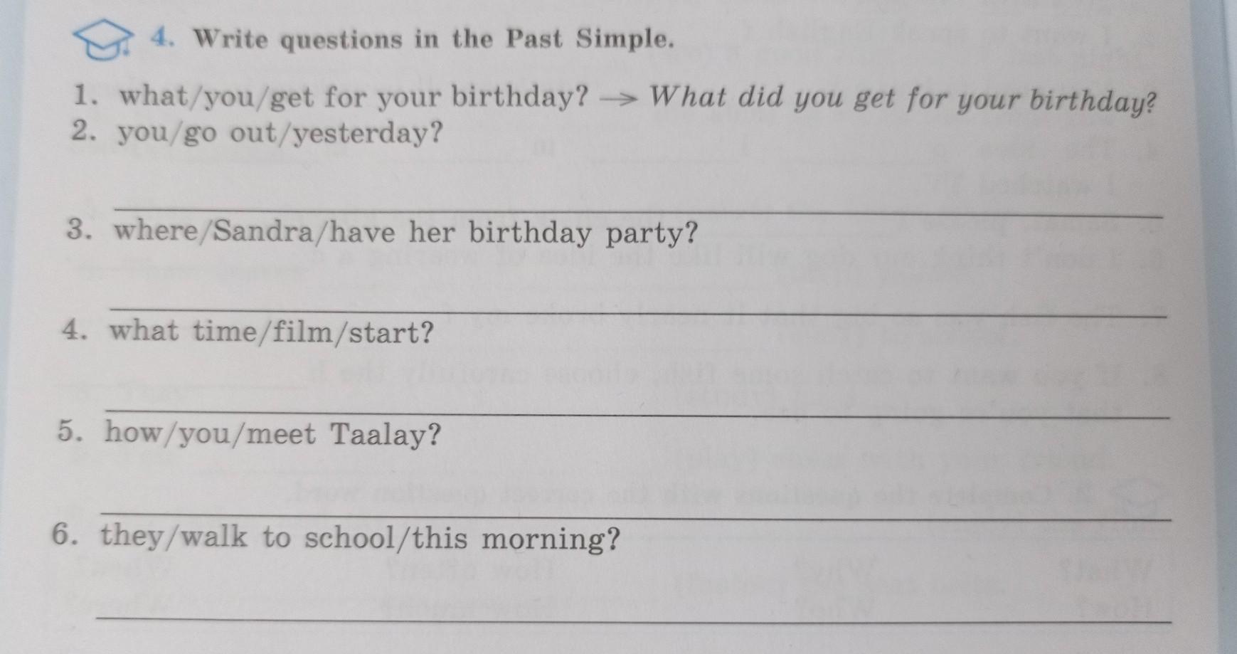 Write questions in the Past Simple. 1. what/you/get for your birthday? → What did you get for your birthday? 2. you/go out/yesterday? 3. where/Sandra/have her birthday party? 4. what time/film/start? 5. how/you/meet Taalay? 6. they/walk to school/this morning?