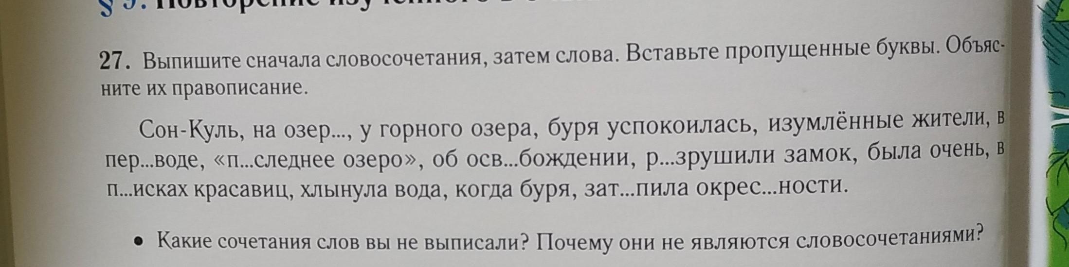 27. Выпишите сначала словосочетания, затем слова. Вставьте пропущенные буквы. Объяс- ните их правописание. Сон-Куль, на озер..., у горного озера, буря успокоилась, изумлённые жители, в пер..воде, «П..следнее озеро», об осв...бождении, р...зрушили замок, была очень, в П...исках красавиц, хлынула вода, когда буря, зат...пила окрес...Ности. • Какие сочетания слов вы не выписали? Почему они не являются словосочетаниями?