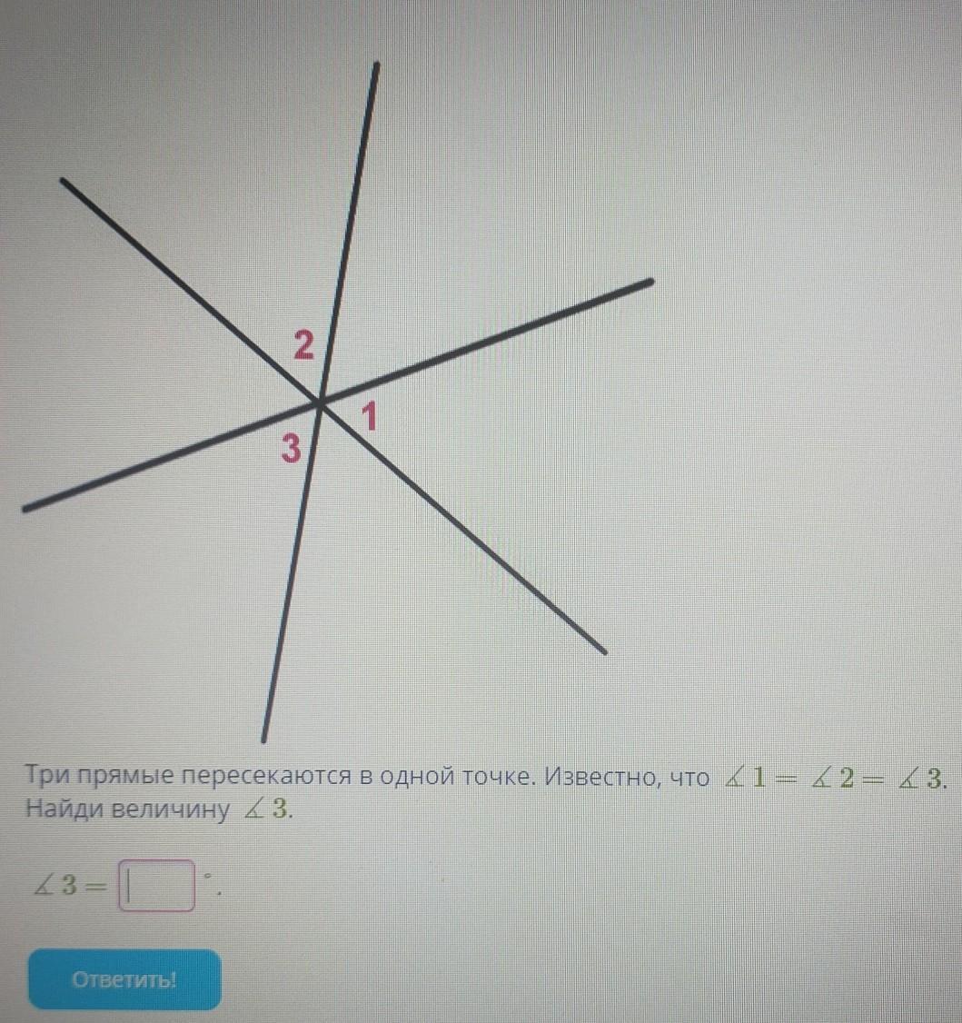 Три прямые пересекаются в одной точке. Известно, что угол 1 = угол 2 = угол 3. Найди величину угол 3