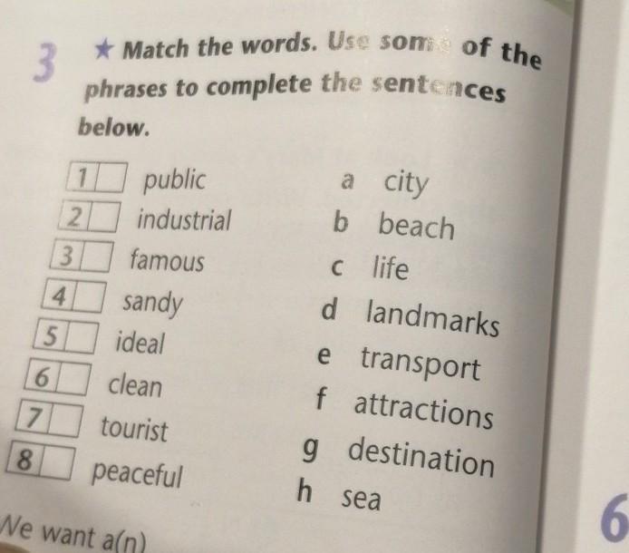 3 * Match the words. Use some of the phrases to complete the sentences below. a city b beach c life 1 public 2 industrial 3 famous 4 sandy 5 ideal 6 clean 7 tourist 8 peaceful d landmarks e transport f attractions g destination sea We want alnı