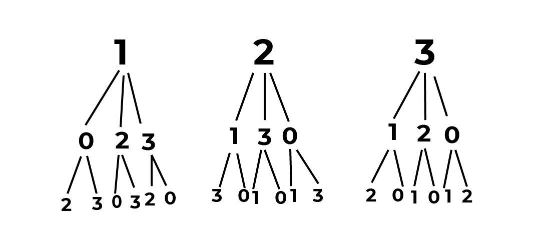 102, 103, 120, 123, 132, 130, 213, 210, 231, 230, 201, 203, 312, 310, 321, 320, 301, 302.