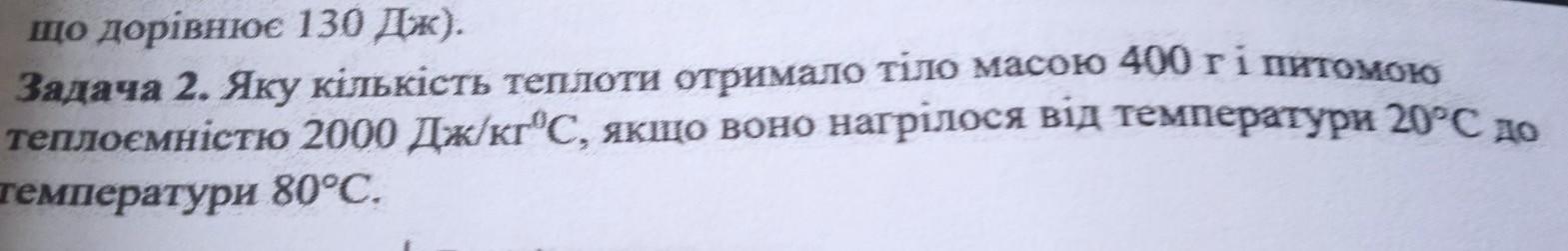 яку кількість теплоти отримало тіло масою 400 г і питомою теплоємністю 2000 Дж/кг°С, якщо вона нагрілося від температури 20°С до температури 80°С