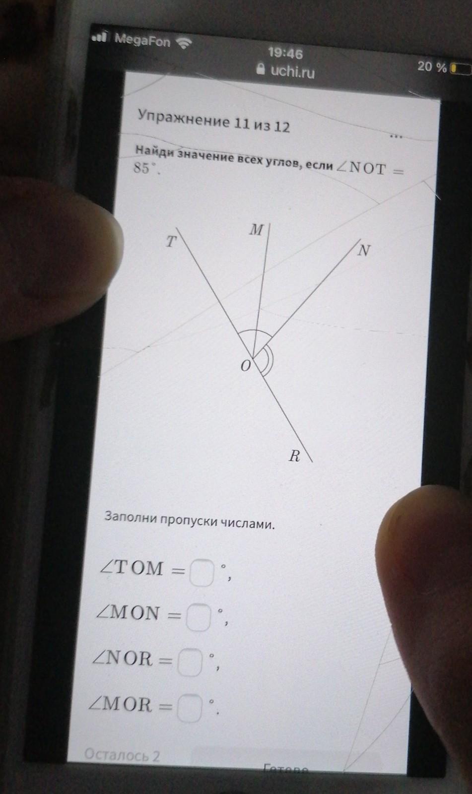 Объяснение: если угол NOT равен 180° то, угол TOR-NOT=180-85=95°(св.смеж. углов) - угол NOR. Угол NOT:2=42,5°- углы MON, MOT