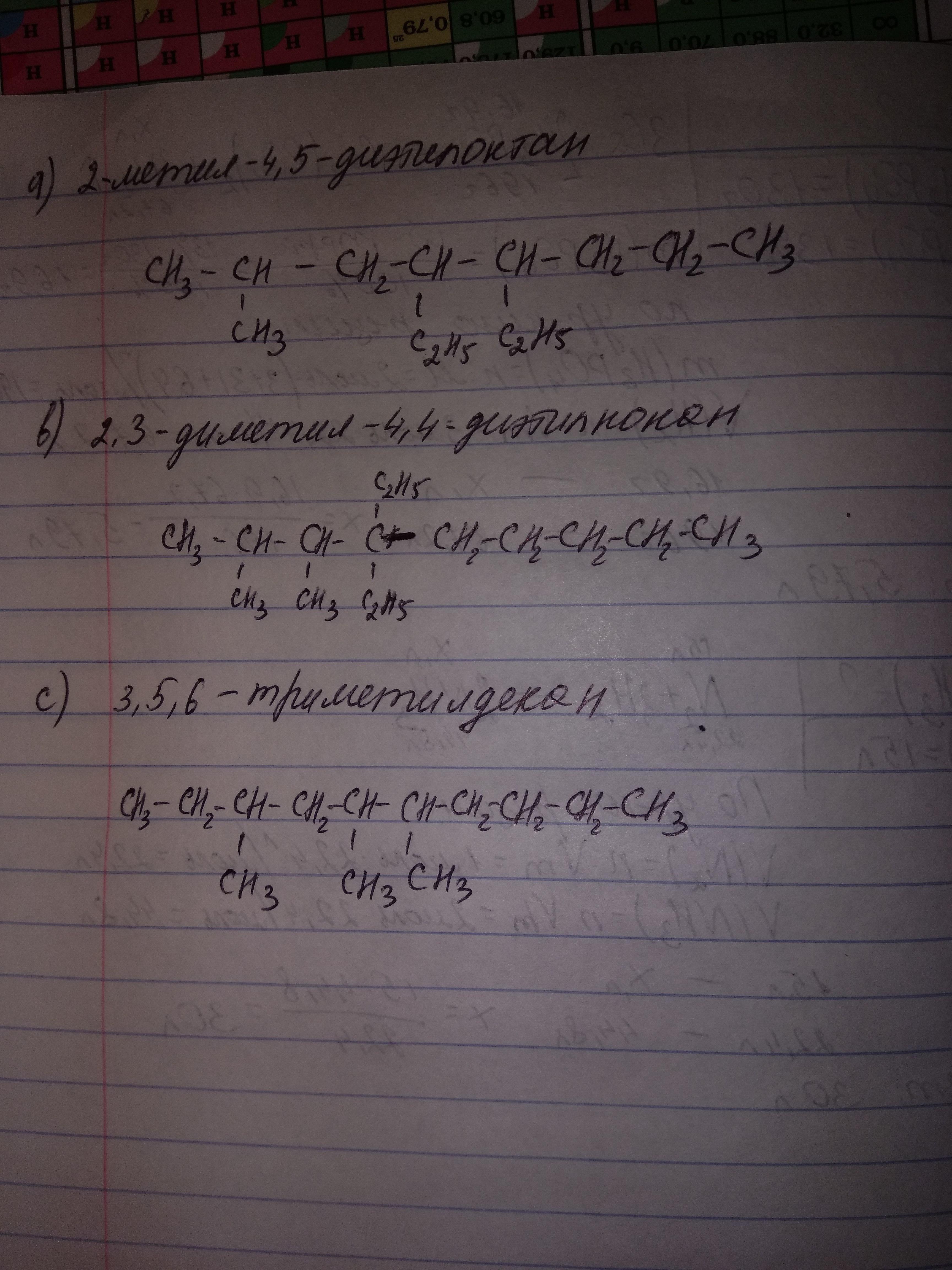 Составить структурные формулы a) 2-метил-4,5-диэтил-октан b) 2,3-диметил-4,4-диэтил-нонан с) 3,5,6-триметил-декан
