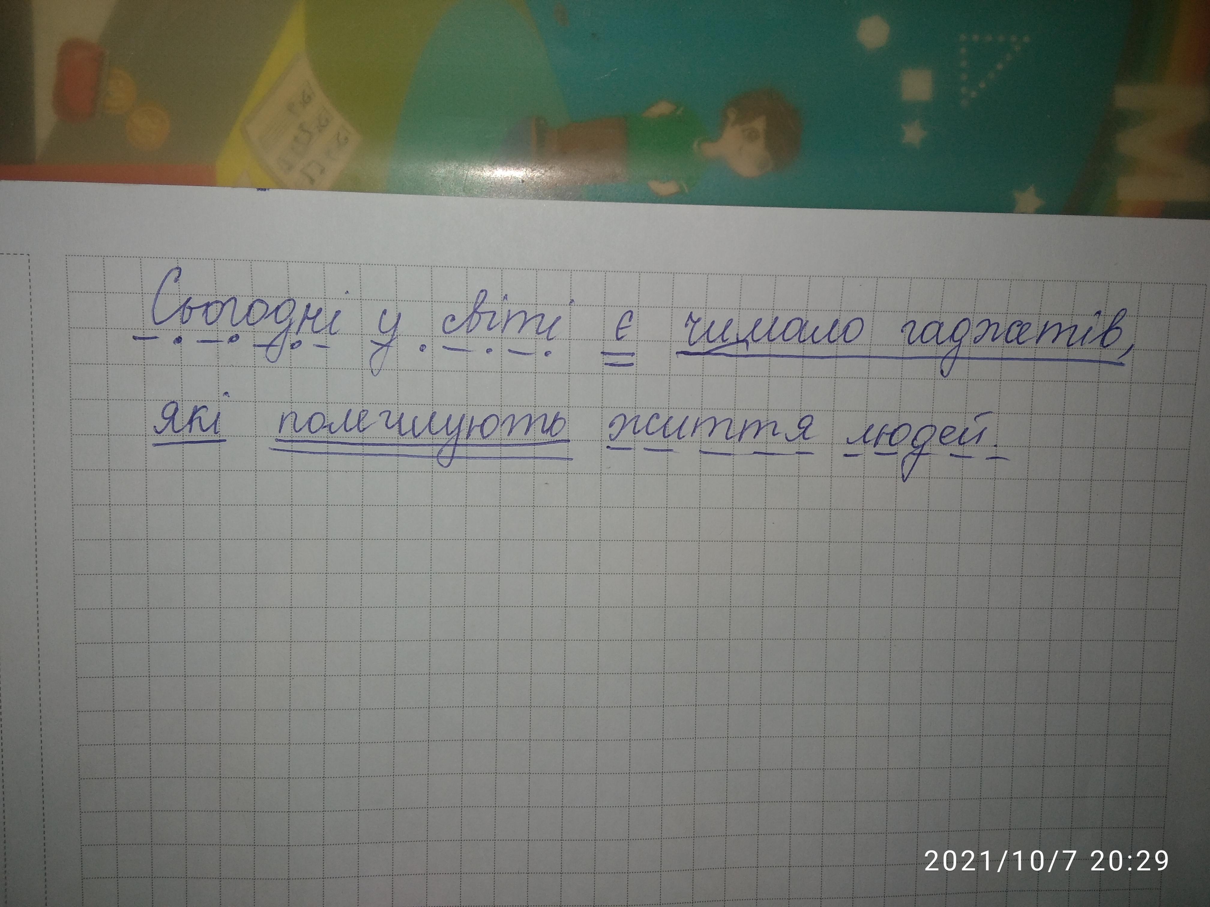 Сьогодні(обставина часу) у світі(обставина місця) є (присудок) чимало гаджетів(підмет), які (підмет, бо можна замінити словом гаджети) полегшують( присудок) життя ( додаток) людей(додаток).