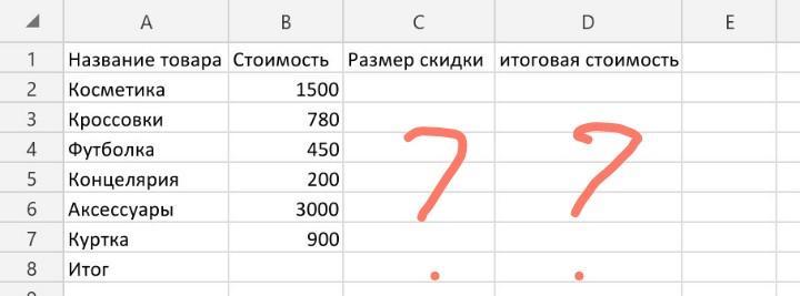 Формула: =B2-(B2*C2) – узнать «Итоговая стоимость»