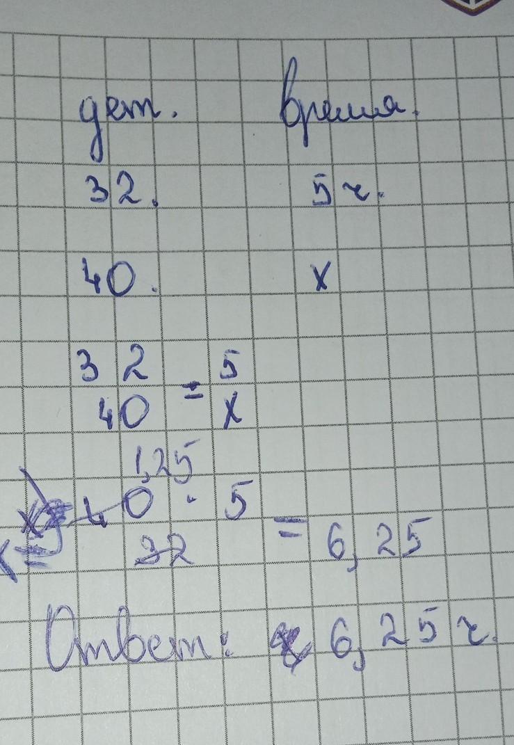 Определите вид зависимости величин и решите задачу с помощью составления пропорции. Изготавливая по 32 детали в час, рабочий трудился 5 часов. Сколько времени ему понадобилось бы на эту же работу, если бы он делал в час по 40 деталей