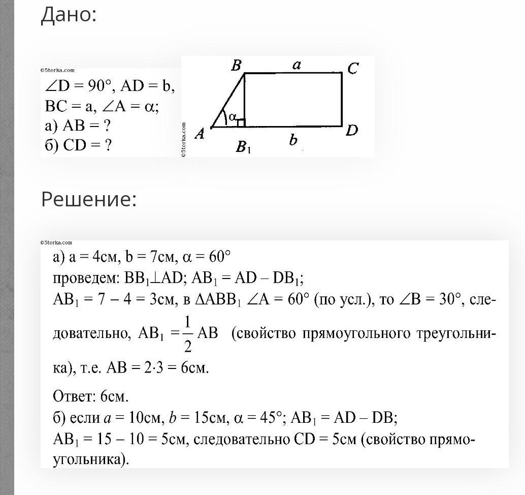 пеции, если а= 4 см, b=7 см, а = 60°; б) меньшую боковую