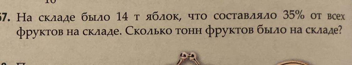 35%=0,3. 14:0,35=1400:35=40 тн фруктов было на складе.
