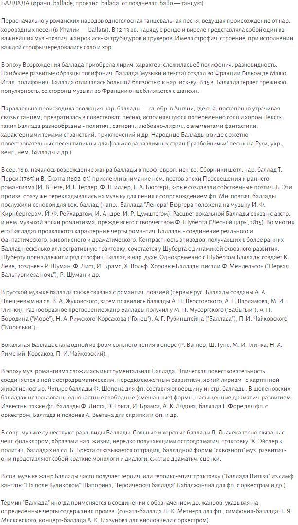 В русской музыке баллада также связана с романтич. поэзией (первые рус. Баллады созданы А. А. Плещеевым на сл. В. А. Жуковского, затем появились баллады А. Н. Верстовского, А. Е. Варламова, М.И. Глинки). Разнообразное претворение жанр Баллады получил у М. П. Мусоргского ("Забытый"), А. П. Бородина ("Море"), Н. А. Римского-Корсакова ("Гонец"), А. Г. Рубинштейна ("Баллада"), П. И. Чайковского ("Корольки").