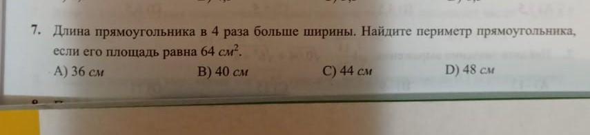 Длина прямоуголника в 4 раза больше ширины. Найдите периметр прямоугольника если его площадь равна 64 см в кубе