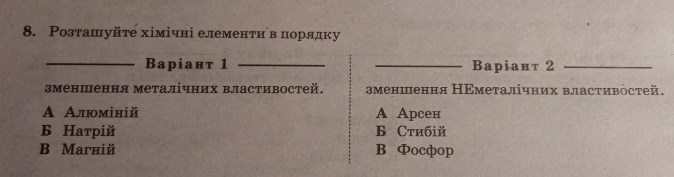 1.Розташуйте хімічні елементи в порядку зменшення металічних властивостей