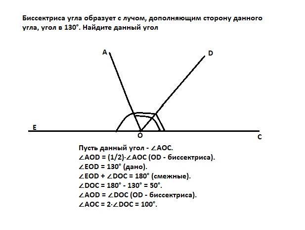 СРОЧНО!!Бісектриса кута утворює з променем,доповняльним до сторони даного кута,кут у 130°. Знайдіть даний кут