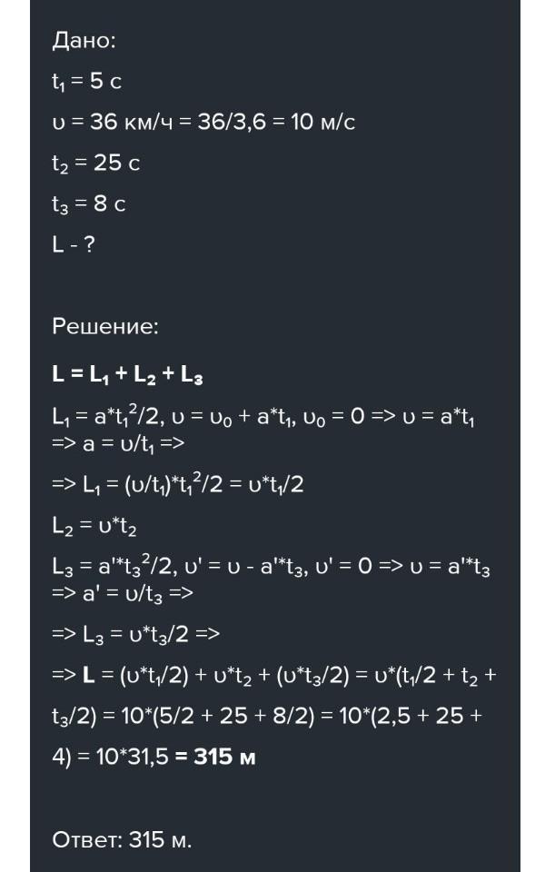 Движение городского автобуса от одной остановки до другой можно разделить на несколько участков. На первом участке (разгон) скорость возрастает до 18 км/ч за 5 с. На втором участке автобус движется равномерно в течение 25 с. На третьем участке (торможение) автобус за 10 с останавливается. Определи путь, пройденный автобусом, между остановками.