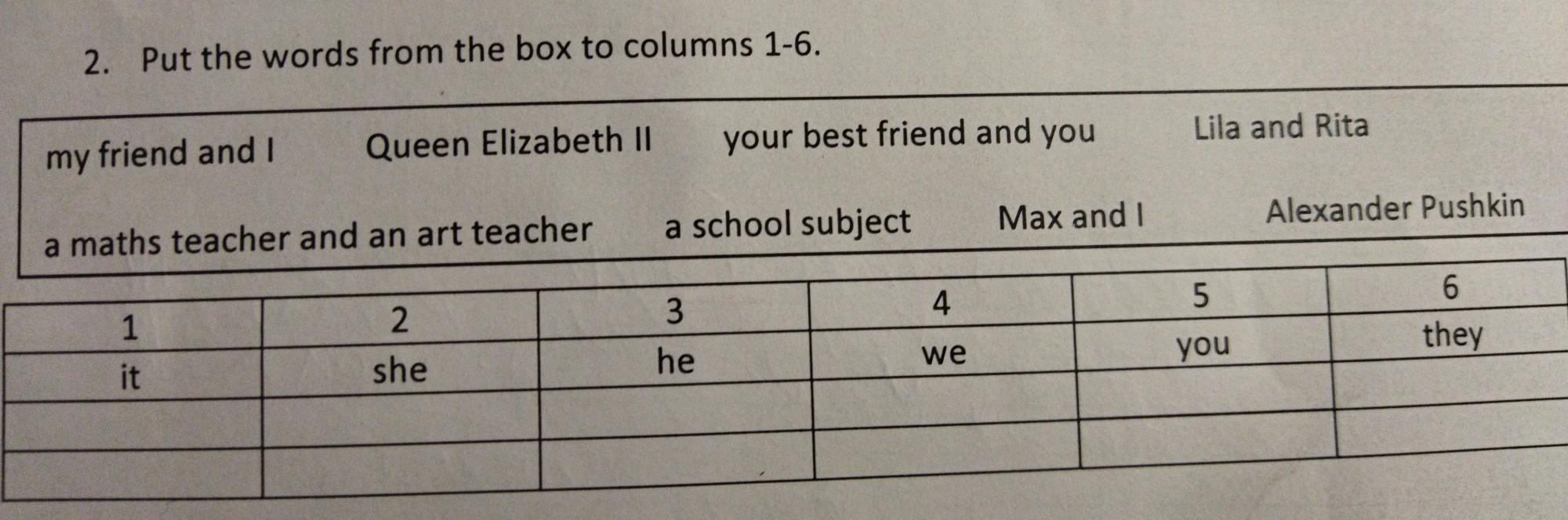 2. Put the words from the box to columns 1-6. my friend and I Queen Elizabeth II your best friend and you a maths teacher and an art teacher Lila and Rita a school subject Max and I 1 Alexander Pushkin it 2 she 3 he 4 5 we you 6 they 3. Answer the que