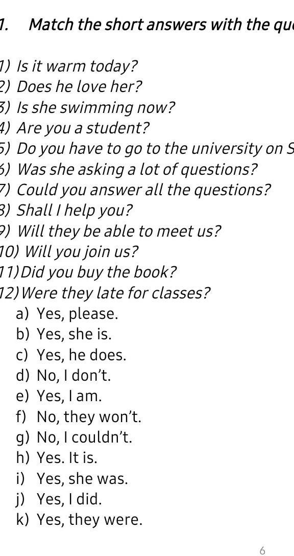 Сопоставьте короткие ответы с вопросами: 5) Sunday