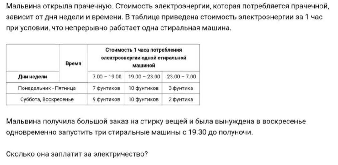 Мальвина открыла прачечную. Стоимость электроэнергии, которая потребляется прачечной,