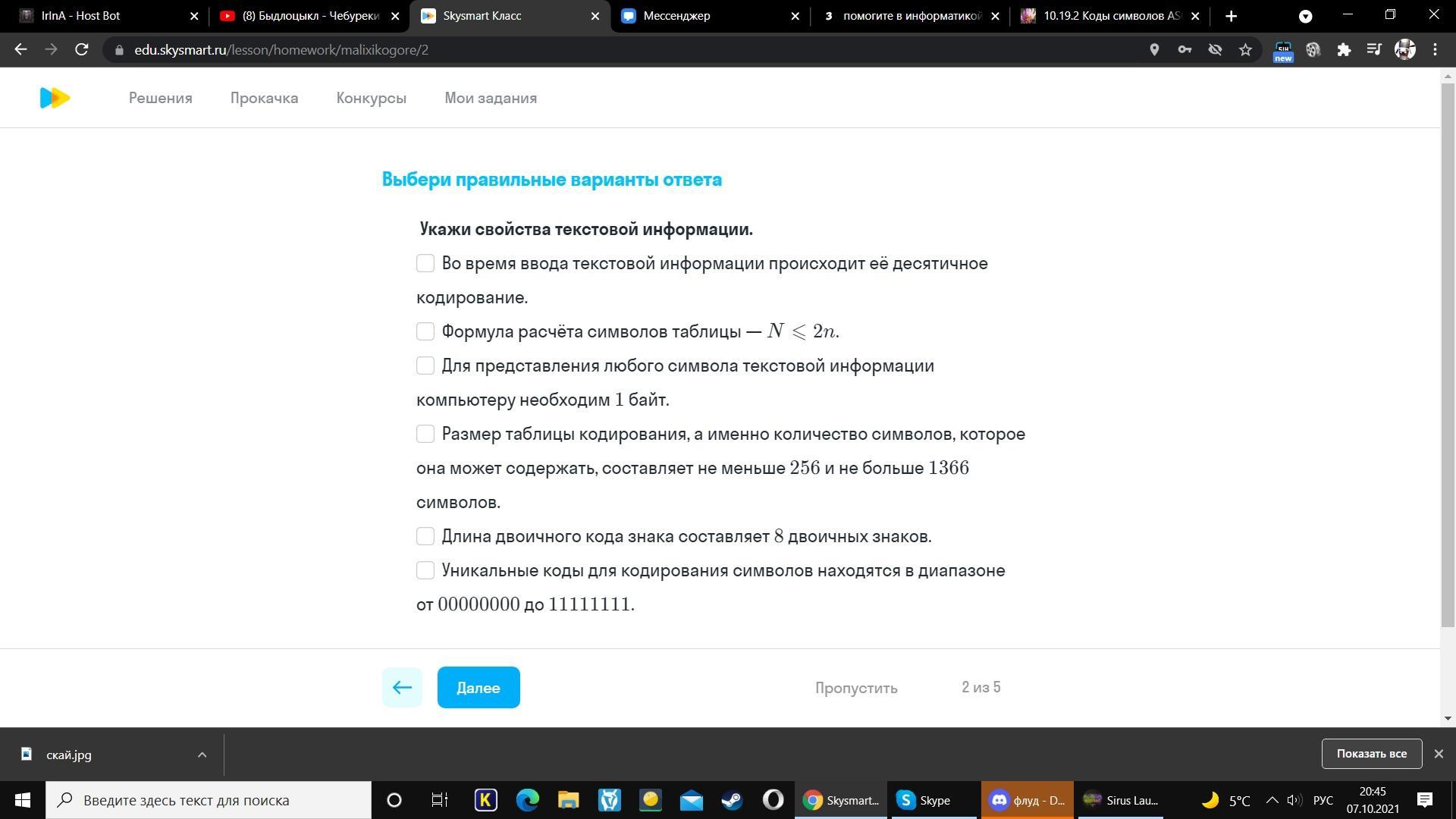 Для кодирования одного символа используется количество информации, равное одному байту, т. е. I = 1 байт = 8 бит.