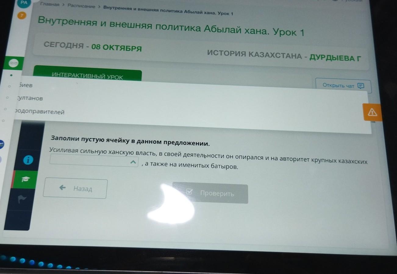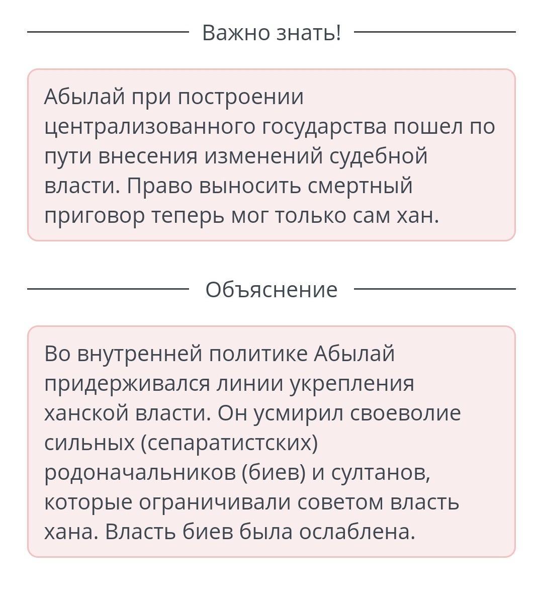 E Внутренняя и внешняя политика Абылай-хана. Урок 1 Заполни пустую ячейку в данном предложении. Усиливая сильную ханскую власть, в своей деятельности он опирался и на авторитет крупных казахских , а также на именитых батыров.