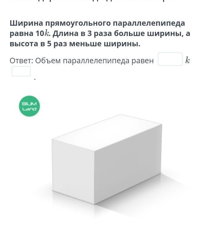 Ширина прямоугольного параллелепипеда равна 10k. длина в 3 раза больше ширины, а высота в 5 раз меньше ширины. ответ: объем параллелепипеда равен