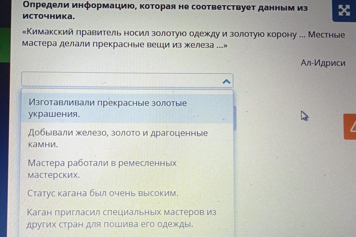 Определи информацию, которая не соответствует данным из источника. «Кимакский правитель носил золотую одежду и золотую корону ... Местные мастера делали прекрасные вещи из железа ...» Ал-Идриси ho - Изготавливали прекрасные золотые украшения. A Добывали железо, золото и драгоценные камни. Мастера работали в ремесленных мастерских. Статус кагана был очень высоким. Каган пригласил специальных мастеров из других стран для пошива его одежды.срочноооооо