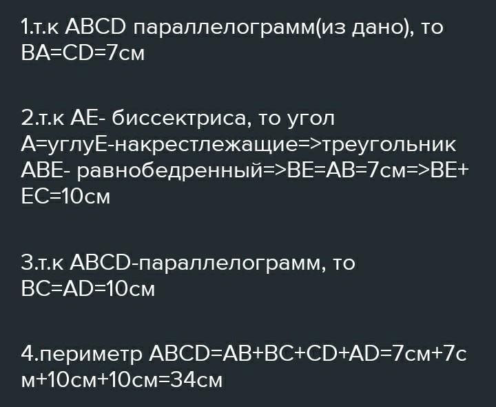 В прямоугольнике ABCD проведена биссектриса АЕ, так что ВЕ=ЕС. Найти периметр прямоугольника, если СD=7