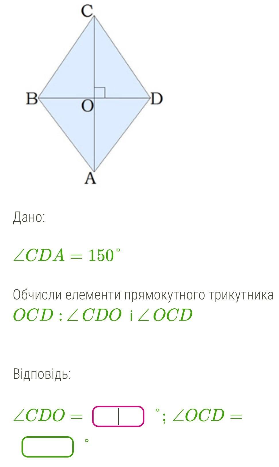 Диагонали ромба являются биссектриссами углов (свойство ромба)