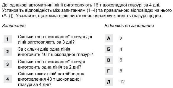 4. Скільки таких ліній потрібно для виготовлення 48 т глазурі за 4 дні? 48:16*2=6 ліній (В)