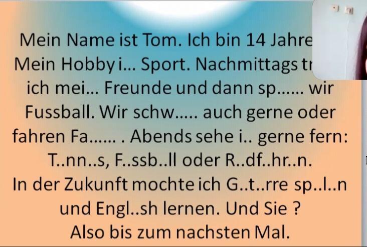 Mein Name ist Tom. ich bin 14 Jahre alt. Mein Hobby ist Sport. Nachmittags treffe ich meine Freunde und dann spielen wir Fußball. Wir schwimmen auch gerne oder fahren Fahrrad. Abends sehe ich gerne fern: Tennis, Fußball oder Radfahren. In der Zukunft möchte ich Gitarre spielen und Englisch lernen. Und Sie? Also bis zum nächsten Mal.