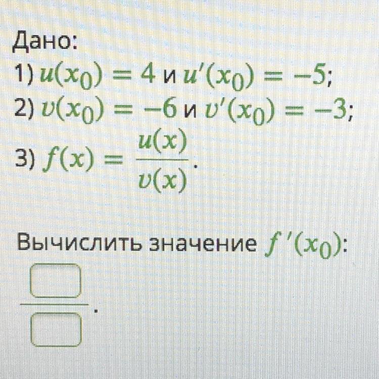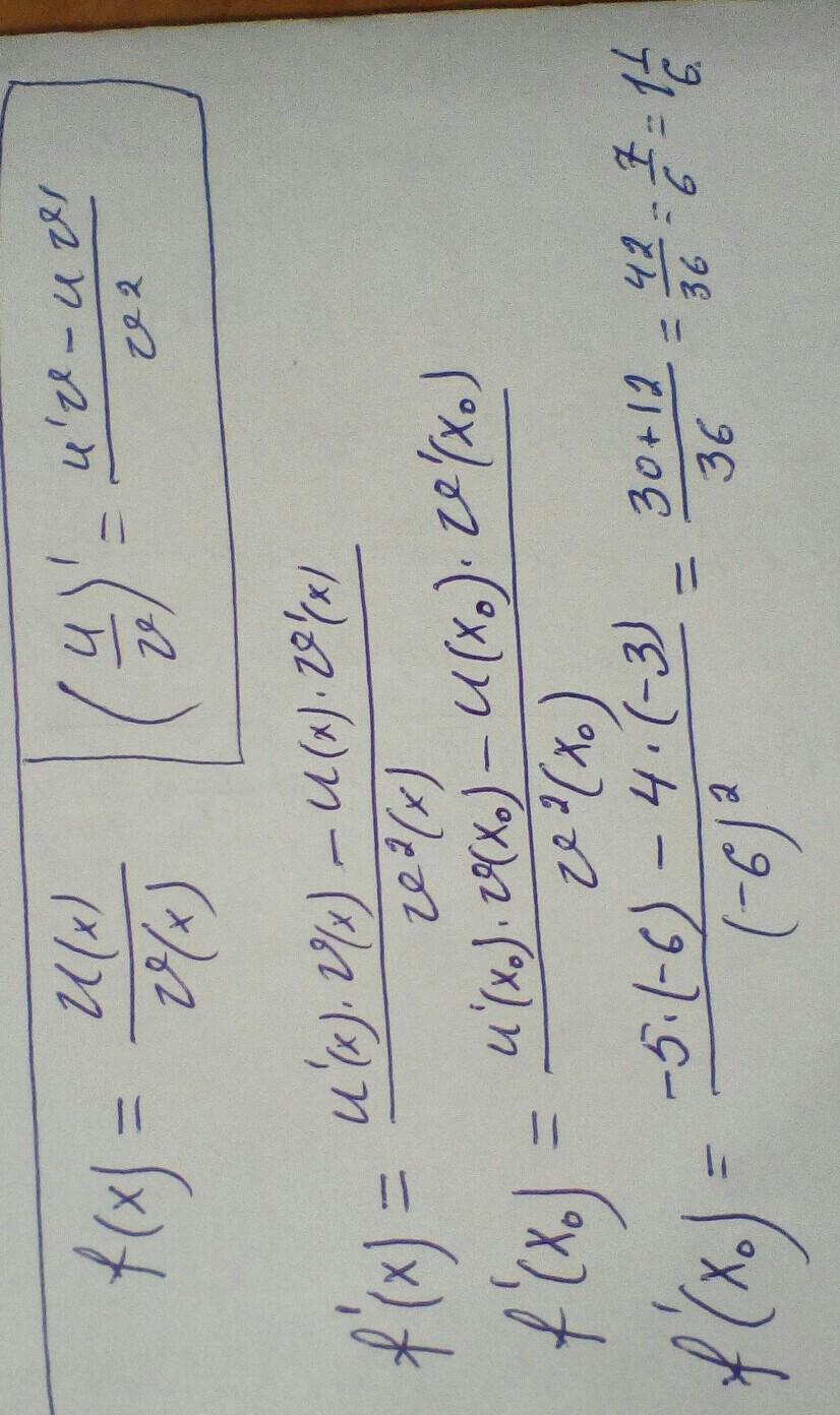 f'(x₀)=(-5·(-6) - (-3)·4) /(-6)² =(30 +12)/36= 42/36=7/6