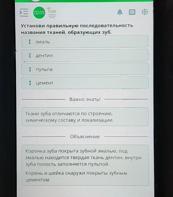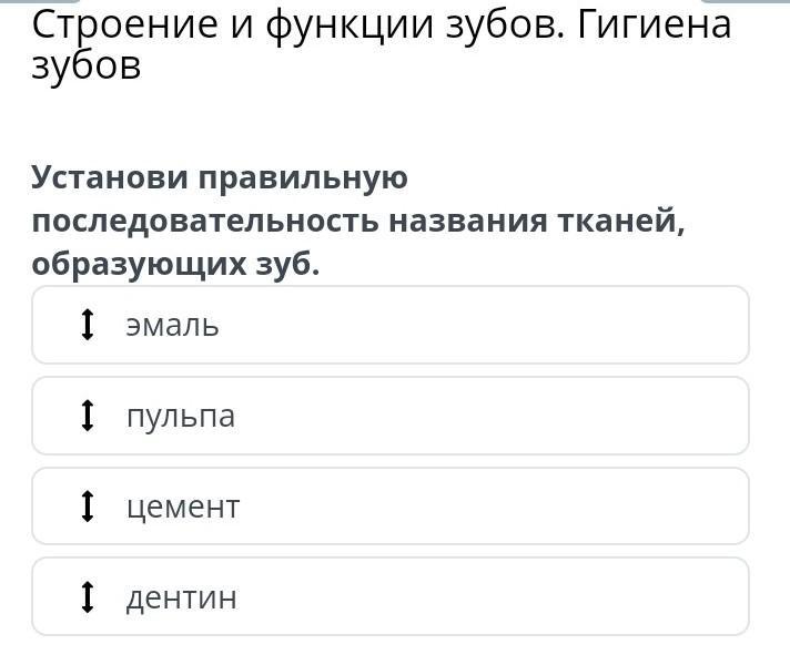 Установи правильную последовательность названия тканей, образующих зуб. 1 эмаль 1 пульпа 1 цемент 1 дентин срочно!!!