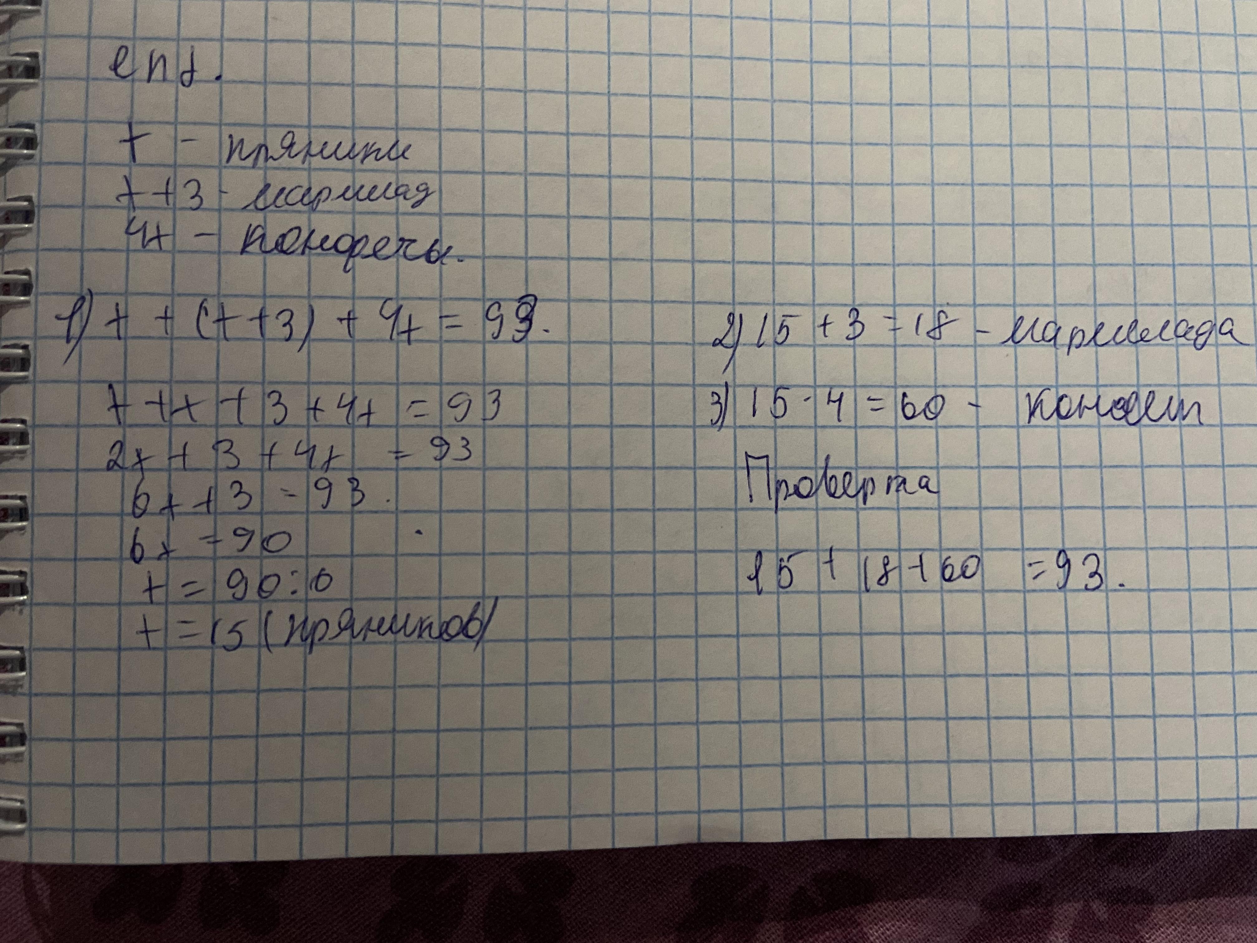 в коробке конфеты пряники и мармелад пряников на 3 меньше чем мармелада и в 4 раза меньше чем конфет сколько каждого вида сладостей если всего их 93