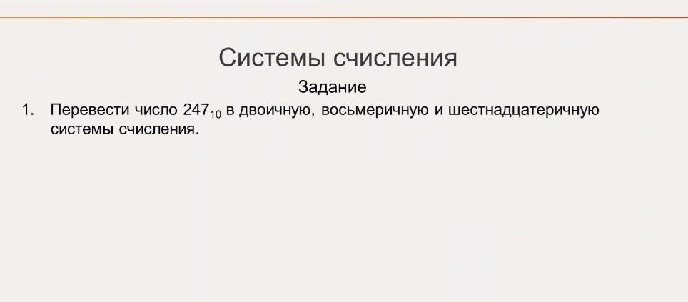 Перевести число 247₁₀ в двоичную, восьмеричную шестнадцатеричную системы счисления.