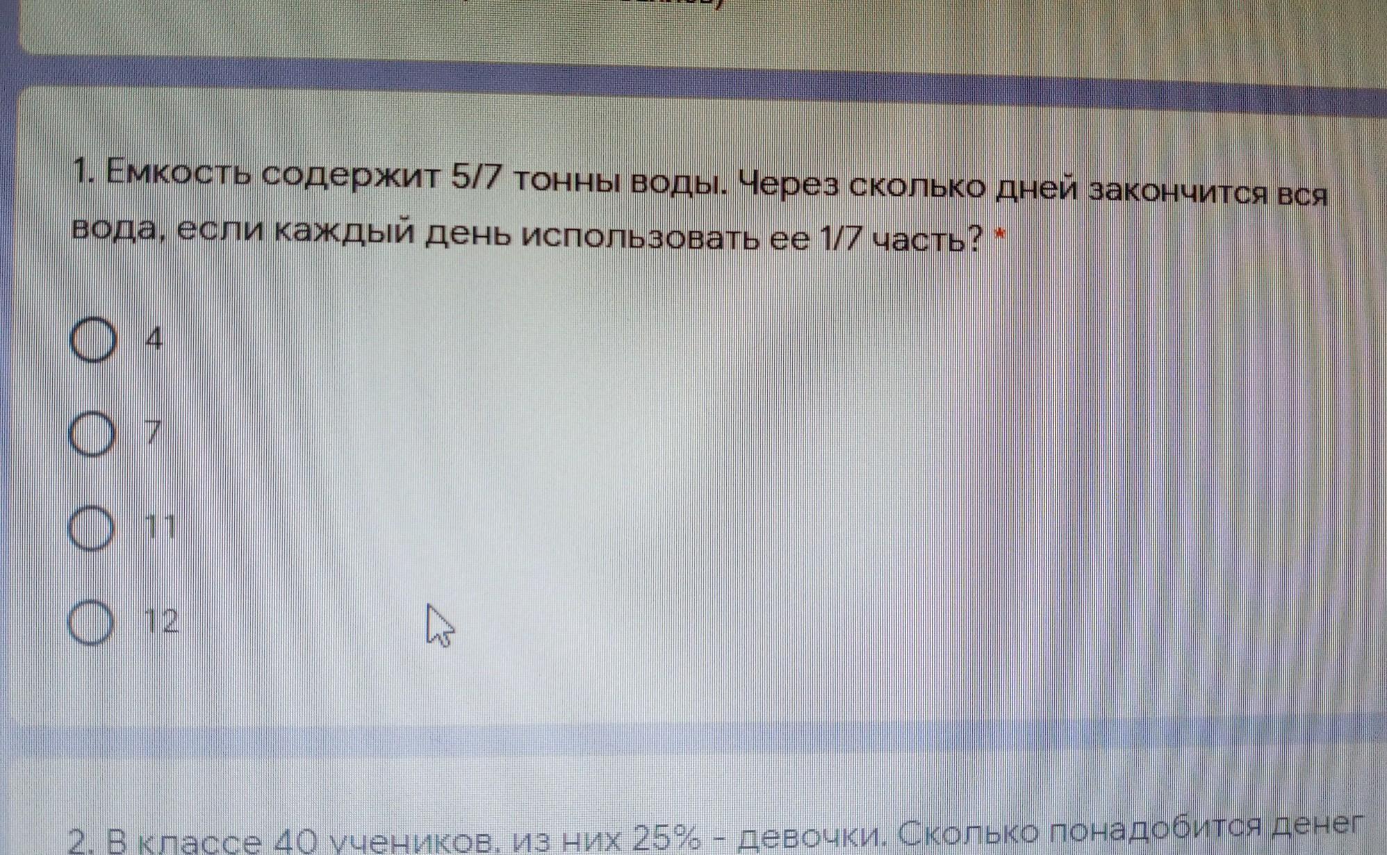 1. Емкость содержит 5/7 тонны воды. Через сколько дней закончится вся вода, если каждый день использовать ее 1/7 часть? * 7 o11 О 12
