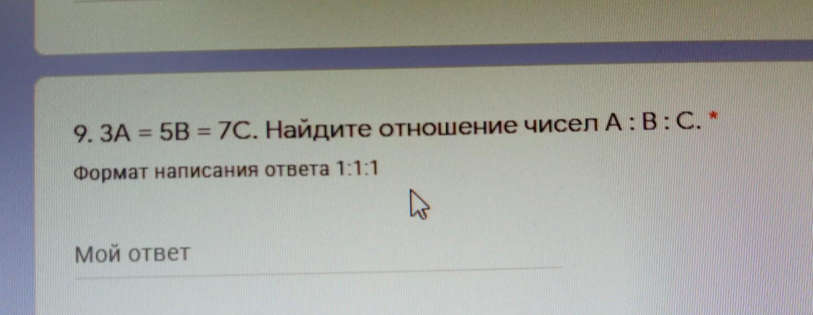 9. ЗА = 5B = 7с. Найдите отношение чисел A:B:С. Формат написания ответа 11:1 N Мой ответ