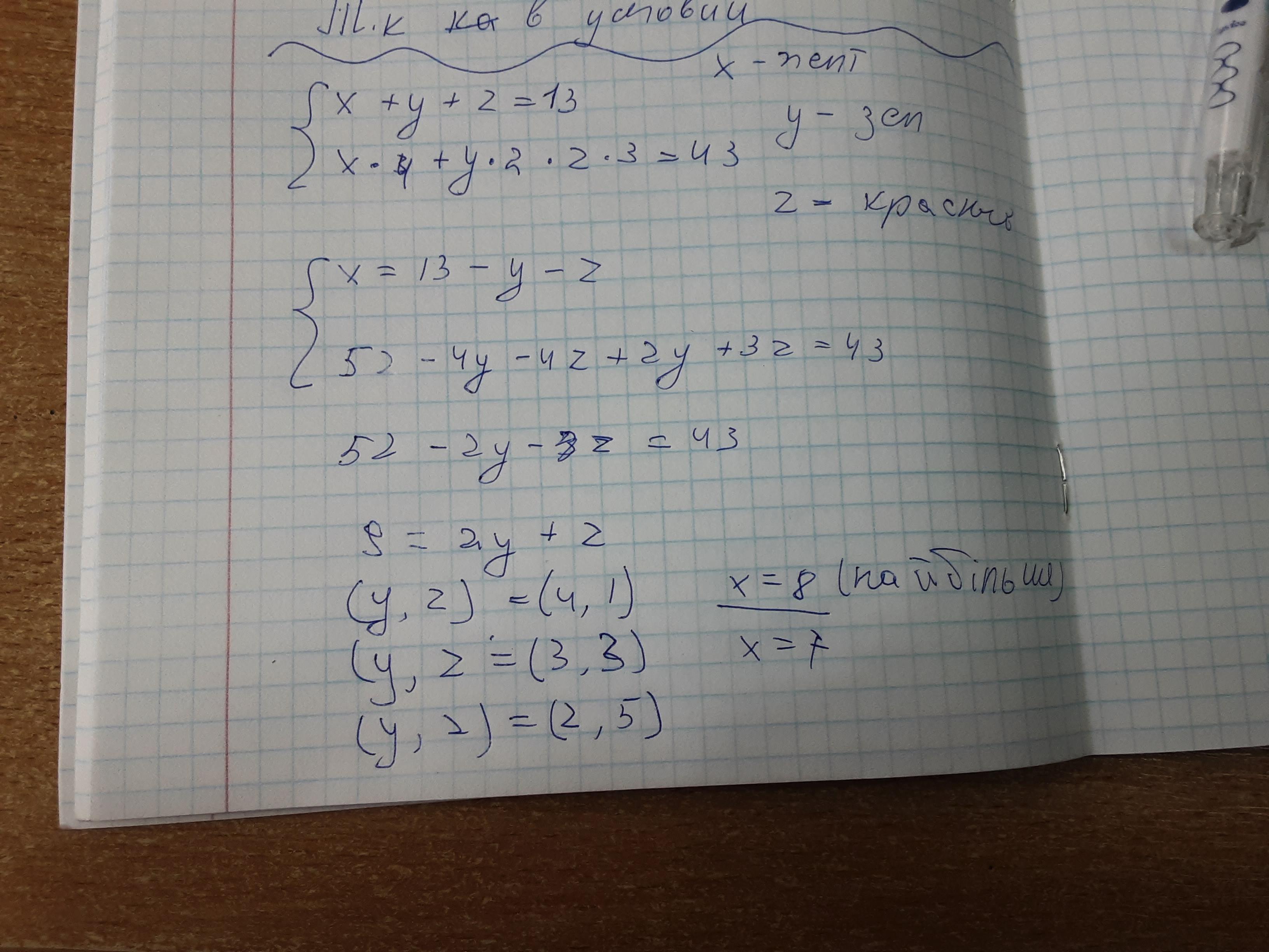 В детском саду 13 столов и 43 стула. У зеленых столов стоит по 2 стула, у красных – по 3 стула, у желтых – по 4 стула. Какое наибольшее количество желтых столов возможно? *