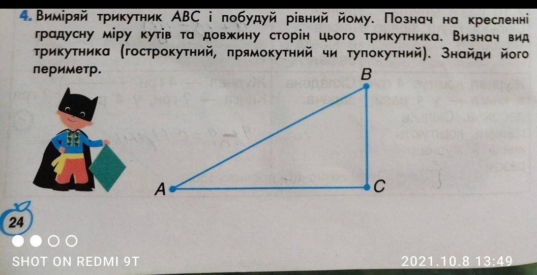 Виміряй трикутник ABC і побудуй рiвний йому. Познач на кресленні градусну міру кутів та довжину сторiн цього трикутника. Визнач вид трикутника (гострокутний, прямокутний чи тупокутний). Знайди його периметр.